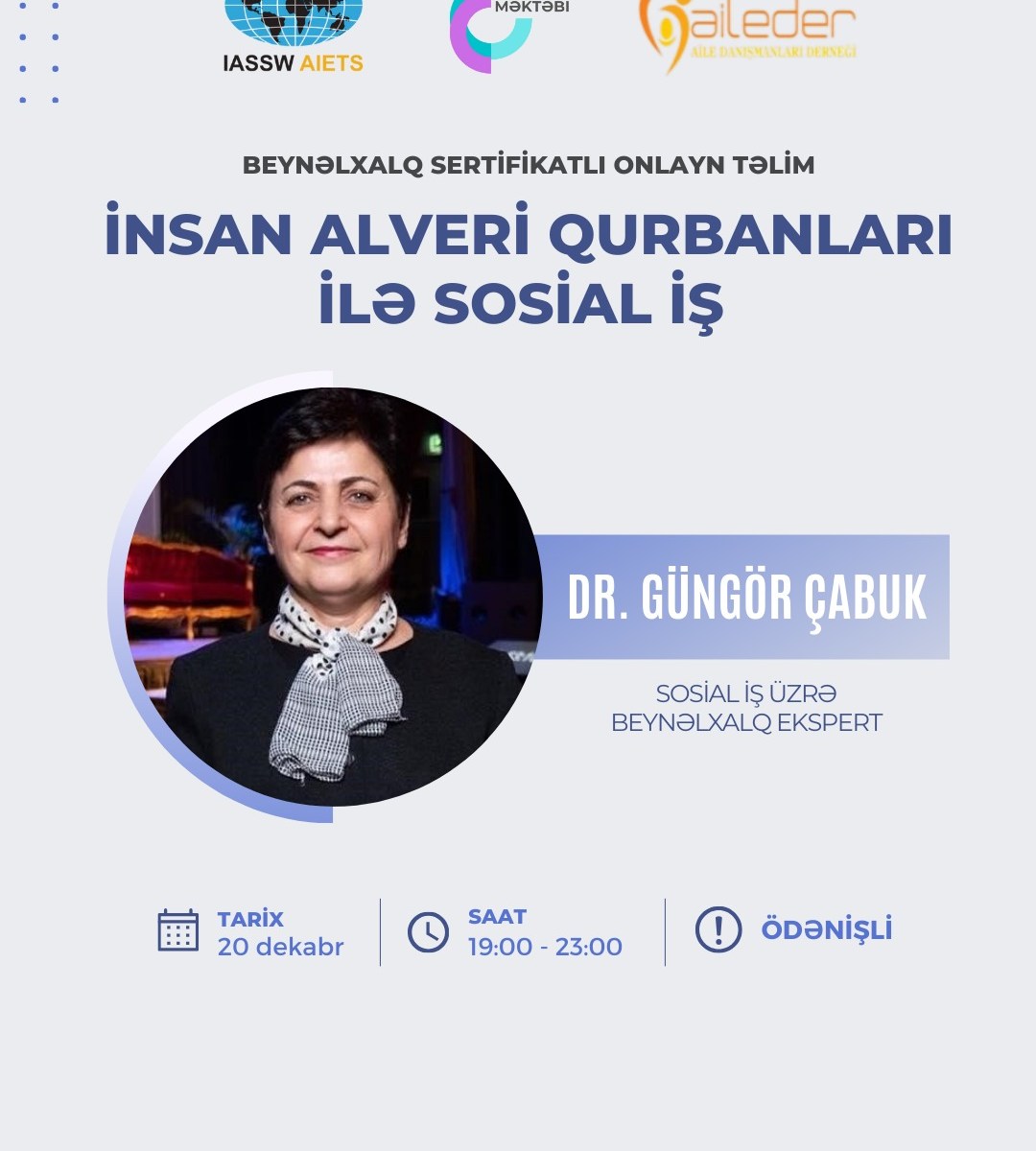 Təlim 20 dekabr 2023-cü il tarixində saat 19:00 – 23:00-da (4 saat) baş tutacaqdır. Təlimçi – sosial iş üzrə beynəlxalq ekspert DR. Güngör Çabukdur.