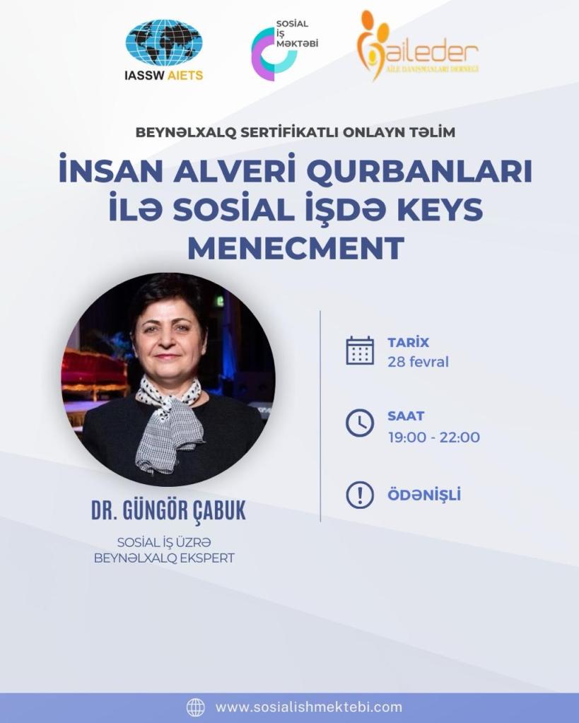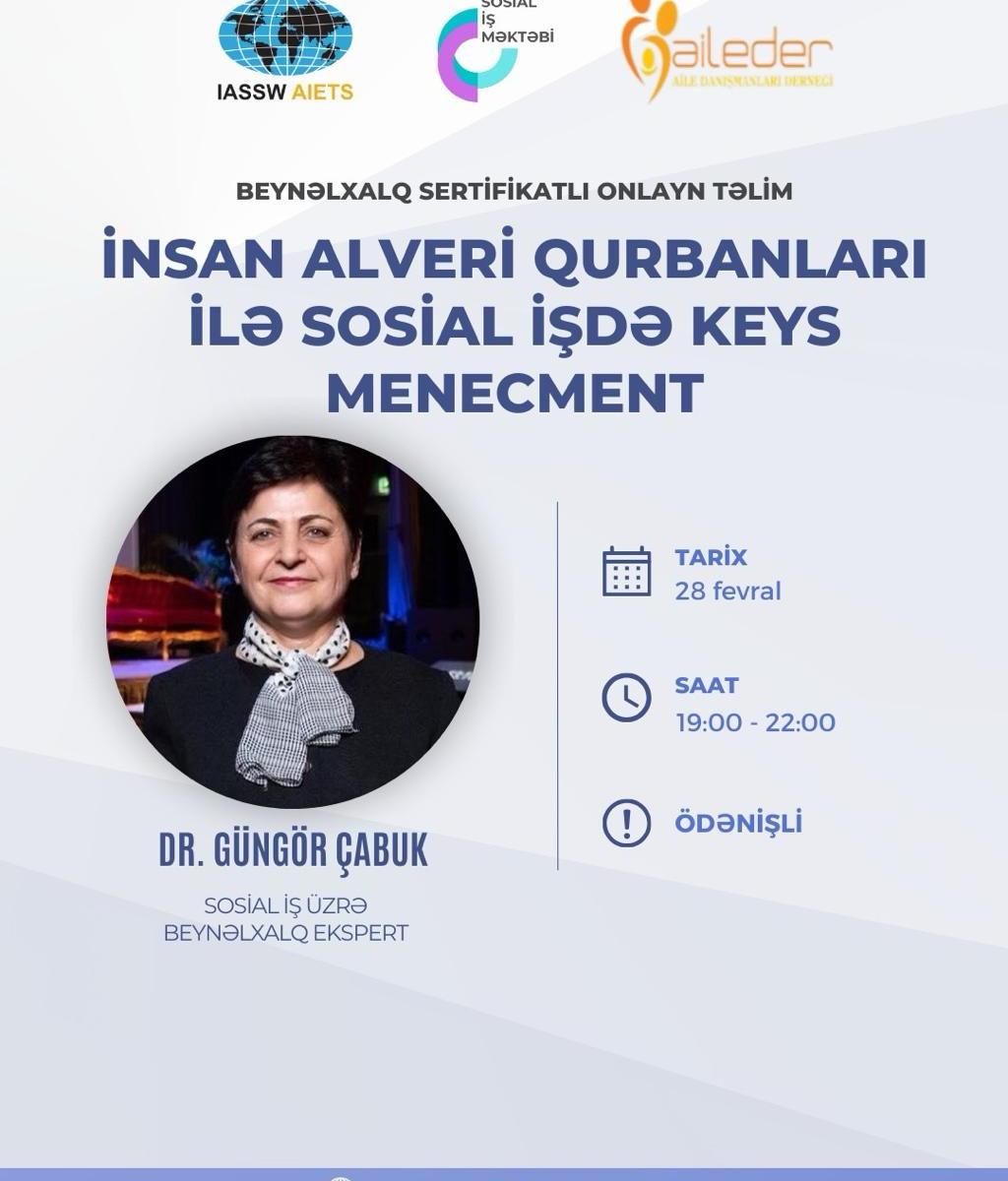 Təlim 28 fevral 2024-cü il tarixində saat 19:00 – 22:00-da (3 saat) baş tutacaqdır. Təlimçi – sosial iş üzrə beynəlxalq ekspert DR. Güngör Çabukdur.